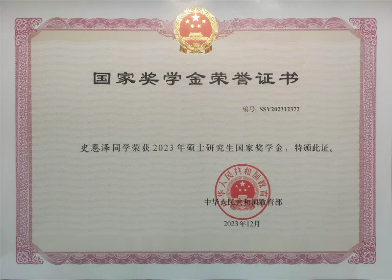 本团队2021级研究生史恩泽荣获2023年度国家奖学金