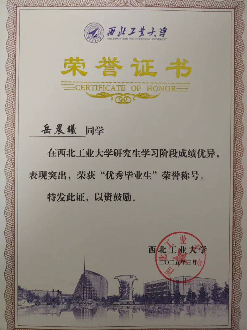 团队成员岳晨曦荣获西北工业大学2025年研究生"优秀毕业生"本团队2022级硕士研究生岳晨曦荣获西北工业大学研究生2025年"优秀毕业生"时间:2025-03-30关键词:获奖,团队要闻 本团队2022级硕士研究生岳晨曦荣获西北工业大学研究生2025年"优秀毕业生"。