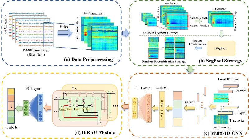 Brain-computer interface (BCI) technology enables humans to interact with computers by collecting and decoding Electroencephalogram (EEG) from the brain. For practical BCIs based on EEG, accurate recognition is crucial. However, existing methods often struggle to achieve a balance between accuracy and complexity. To overcome these challenges, we propose 1D convolutional neural networks with bidirectional recurrent attention unit network (1DCNN-BiRAU) based on the random segment recombination strategy (segments pool, SegPool) which showed in 图1. It has three main contributions. First, SegPool is proposed to increase training data diversity and reduce the impact of a single splicing method on model performance across different tasks. Second, it employs multiple 1D CNNs, including local and global models, to extract channel information with simplicity and efficiency. Third, BiRAU is introduced to learn temporal information and identify key features in time series data, using forward-backward networks and an attention gate in RAU. The experiments show that our model is effective and robust, achieving accuracy of 99.47% and 91.21% on the binary classification of individual and group level, while 90.90% and 92.18% on the four-category classification. Our model demonstrates promising results for recognizing human motor imagery and has the potential to be applied in practical scenarios such as brain-computer interfaces and neurological disorder diagnosis.